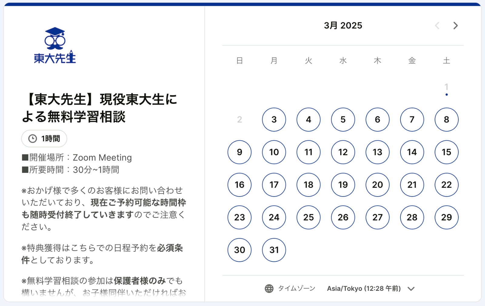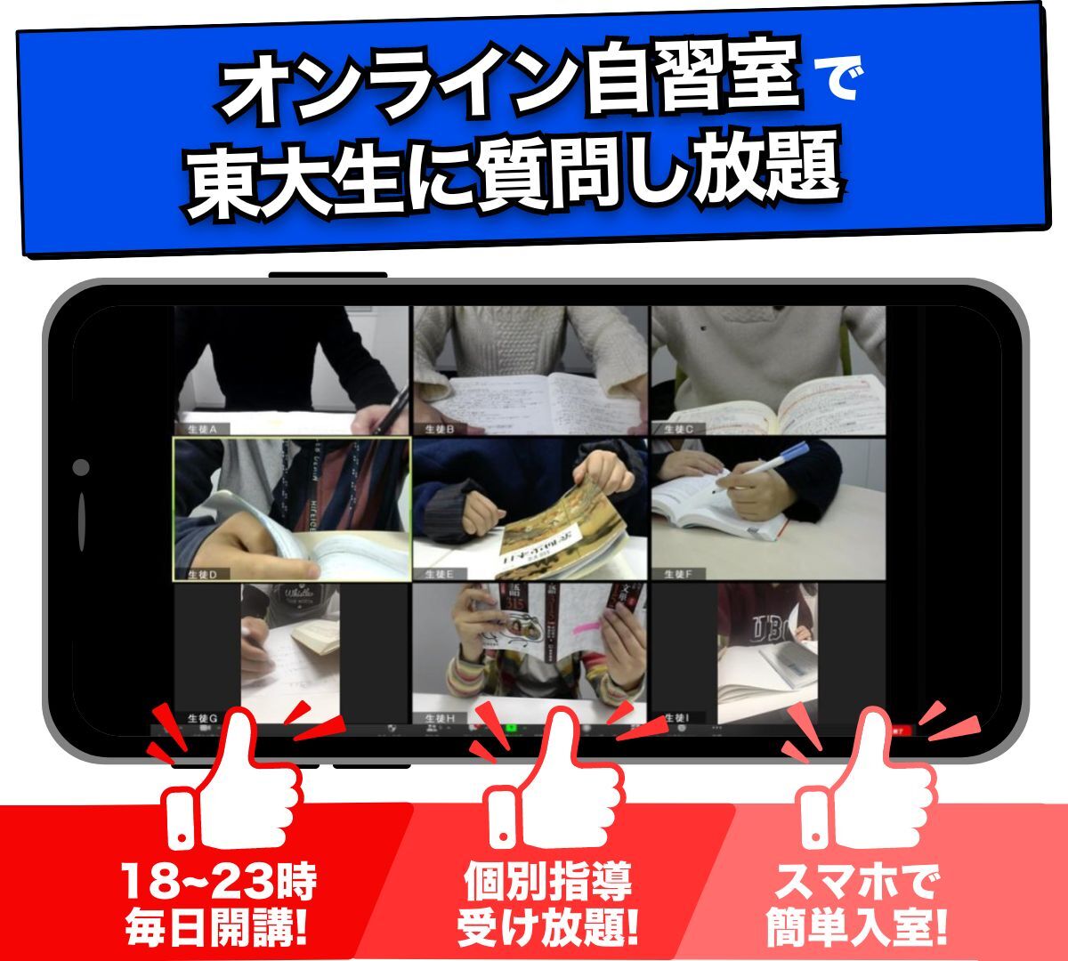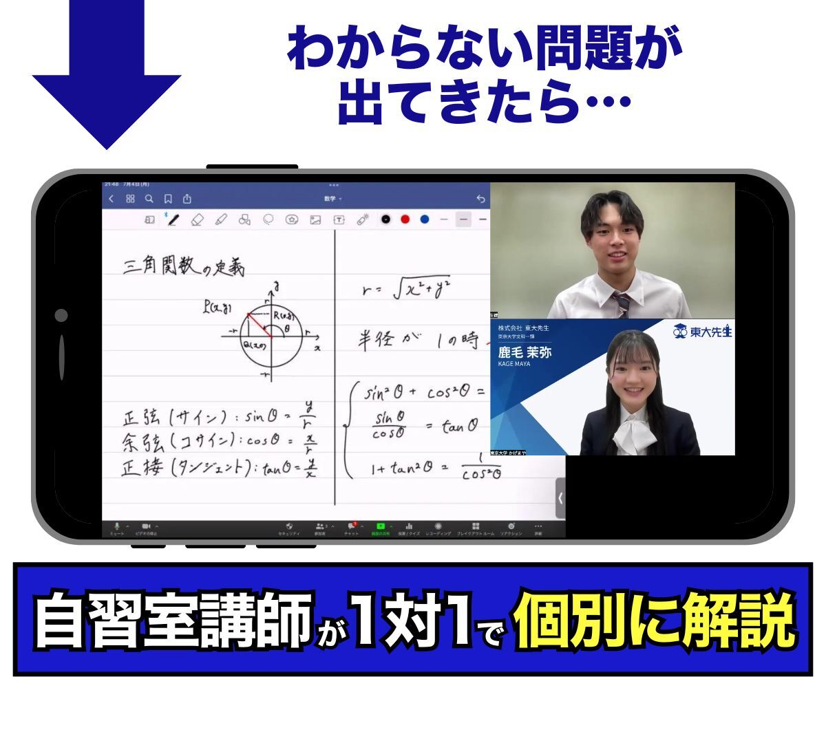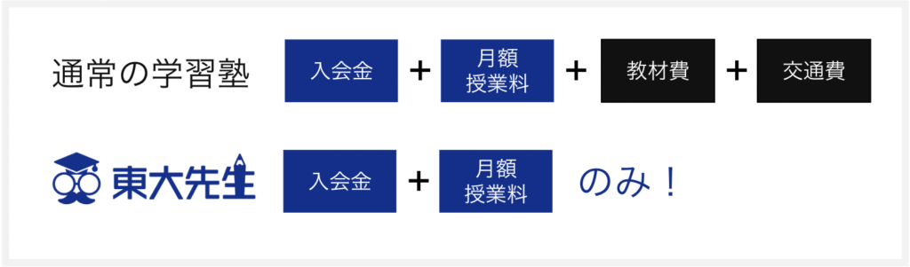 お子様の年齢によって変わってくるので初回面談時に詳しく説明させていただきます。ただ他社サービスよりも安く設定しており、また気軽に始めやすいよう。月に1時間から受講可能となっております。毎日開催しているオンライン自習室では現役東大生から無料でマンツーマン指導を受けることができるのでかなりお得になってます。