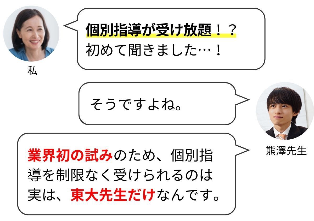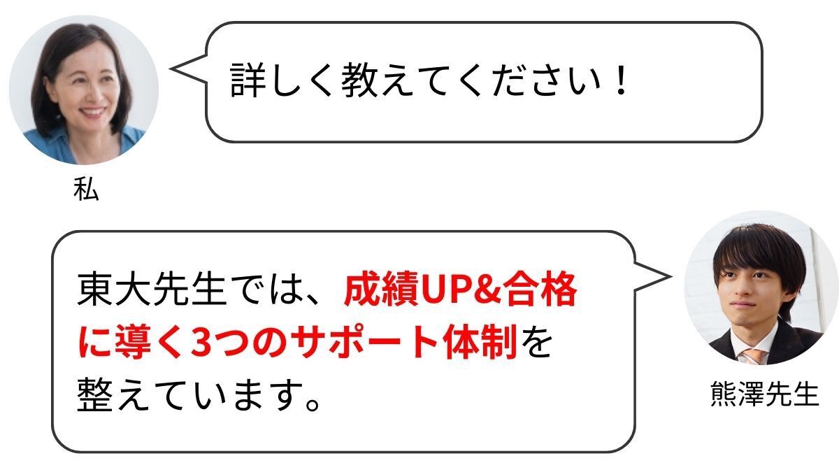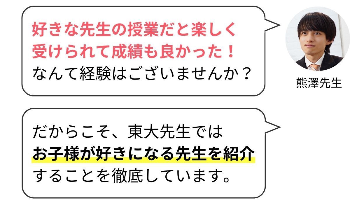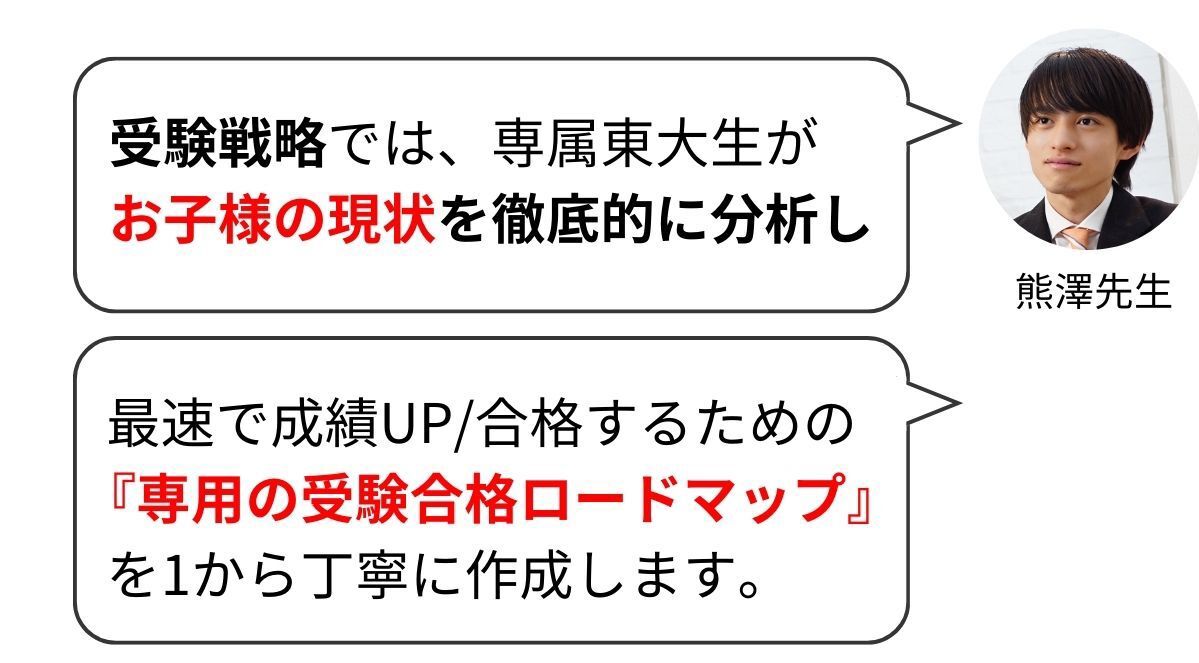 付属の学校だったため受験の対策ではなく内申点の指導をお願いしました。勉強だけじゃなく先生との付き合い方など内申点に関わる全ての要素を洗い出して指導してくださいました。また小論文の対策など塾では見てもらえない分野も細かく添削していただけたので東大先生一本で進学を乗り切ることができ、我が家としてはすごくやりやすかったです。東大生の方は教え方も凄く上手ですが、何よりお話が面白かったです。一つの問題でも、雑学や出題者の意図など関連するお話までたくさんしてくださったので息子も週1回の授業をいつも楽しみにしていました。学ぶことの面白さをインプットしていただけたことが一番の財産だったと思います。