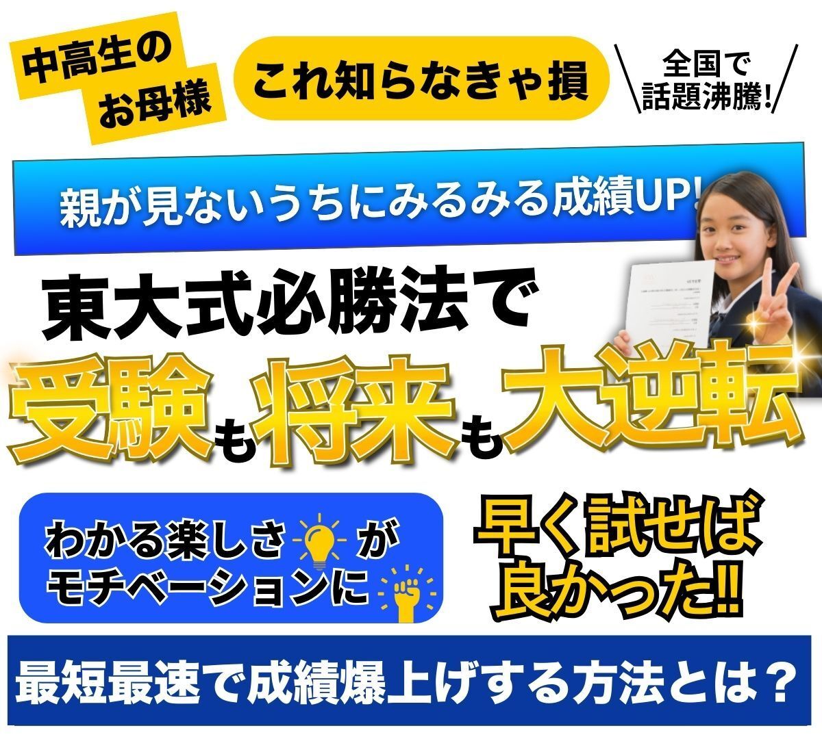 この春絶対に受からないと思っていた公立高校に合格しました。東大先生に通い始めた時は、公立高校なんて夢のまた夢だと思っていたので、私立高校対策をお願いしていましたが、先生の助言もあり公立高校を目指すことに。娘の成績はこの一年で面白いくらいに伸びていき偏差値は35→60、学内順位も下から数えて5番目だったのに、今は上位20名に入るほどです。